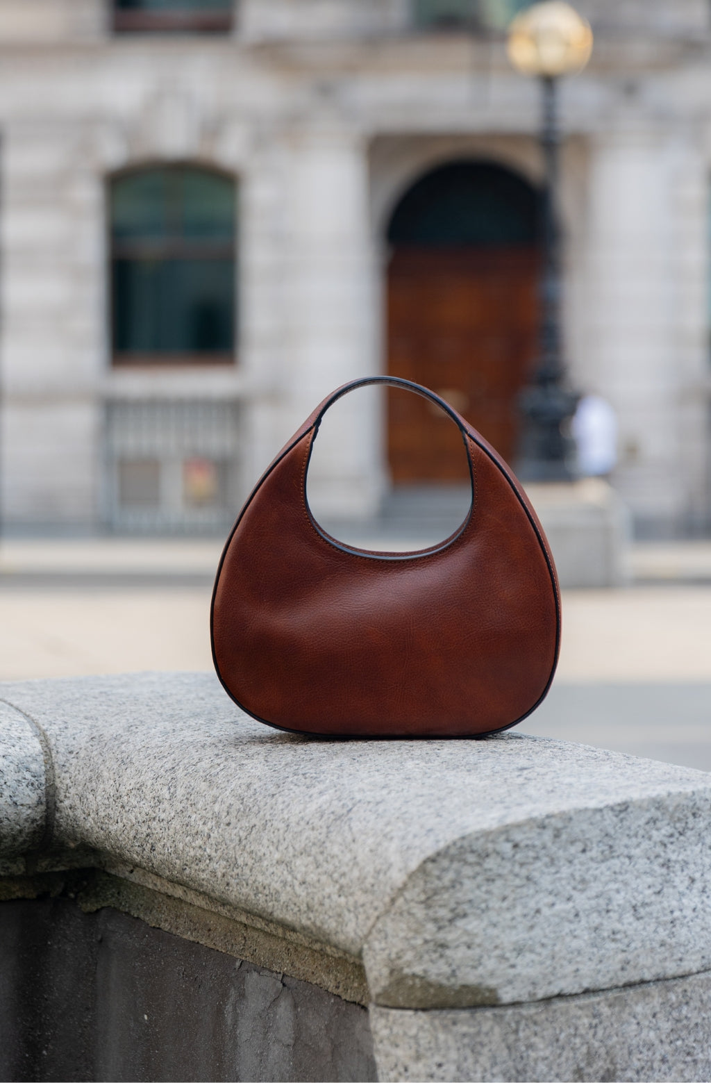 Introducing "The Moonstone" leather handbag, a celestial-inspired accessory that captures the essence of timeless elegance. Crafted with precision, its small, rounded shape evokes tranquil beauty, while the round handle adds a touch of grace. Designed to be cradled in your arm with its compact size, it exudes an aura of effortless sophistication. The zip closure ensures your belongings are securely tucked away, while the sleek minimal design speaks volumes of refined taste. Adorned with the Time Resistance logo on the handle, it's a symbol of quality craftsmanship and enduring style. Illuminate your ensemble with "The" Handbag—an embodiment of celestial allure and understated refinement.