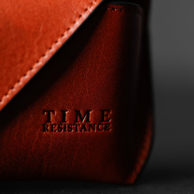 Time Resistance bags and accessories are crafted from premium full-grain, hand-dyed, vegetable-tanned Italian cowhide, known as Vachetta leather, which develops a beautiful patina and ages gracefully over time.