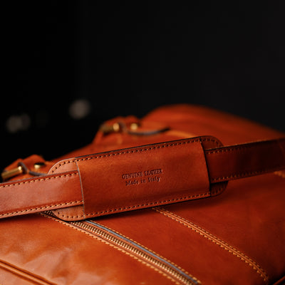 A spacious briefcase for a heavy traveler. This full-grain Italian leather work bag has three compartments and lots of pockets for all your belongings. Carry it in hand, wear it on your shoulder, convert it into a backpack, or use the trolley strap to carry it on a suitcase. Innovative design, premium hand-dyed leather, and clean lines reflect the purpose of this briefcase, which is to make things happen while in style.