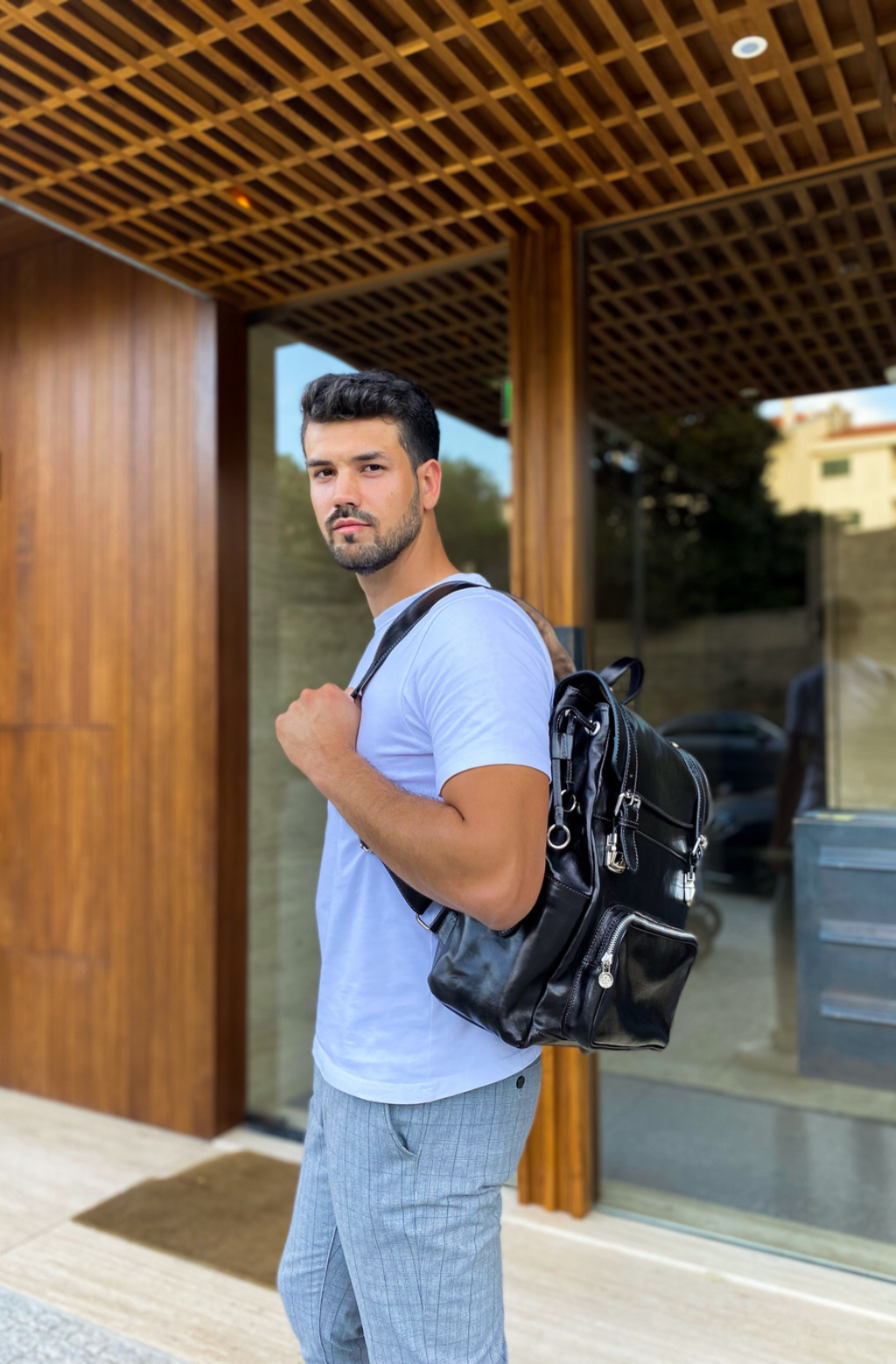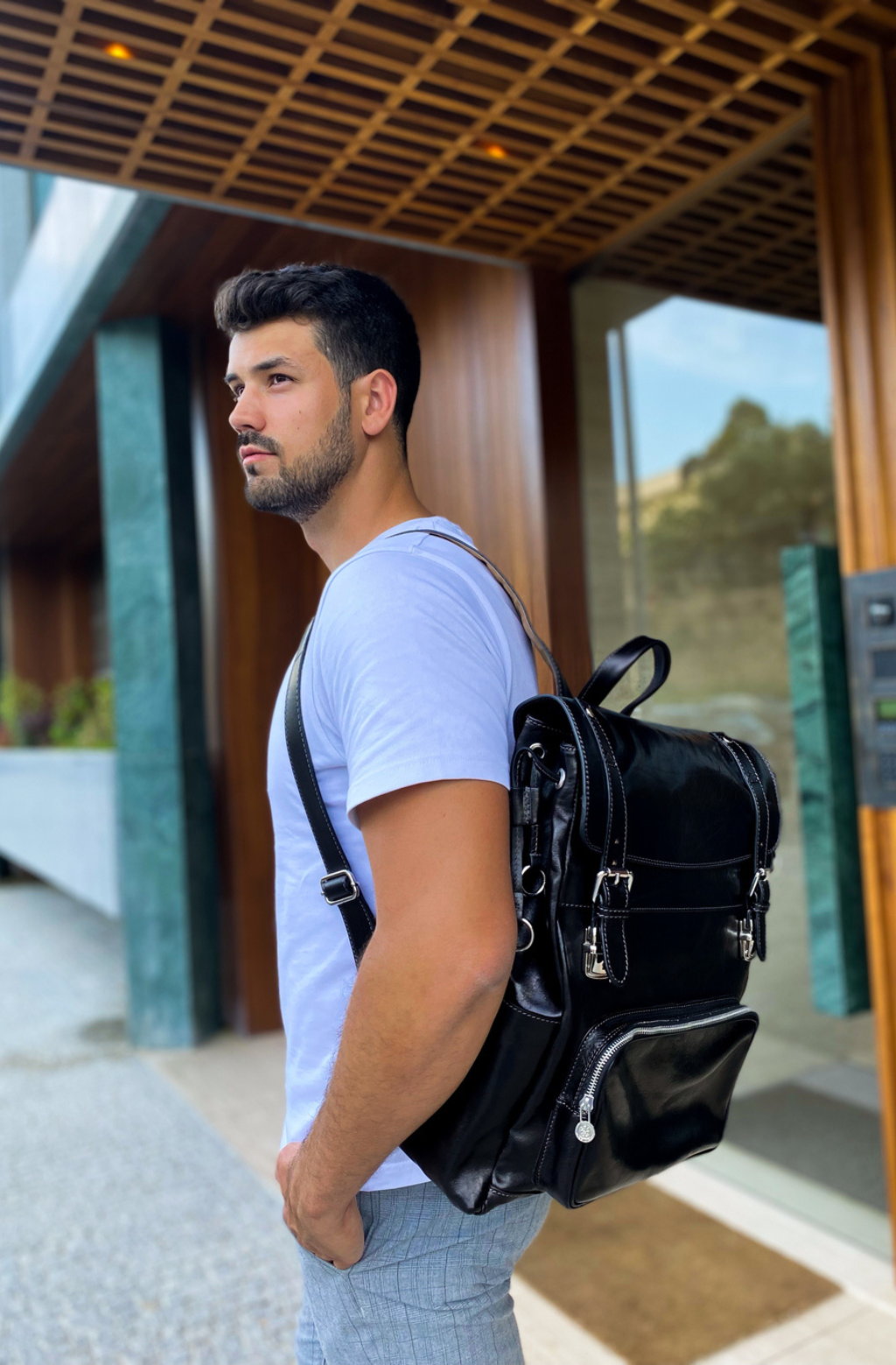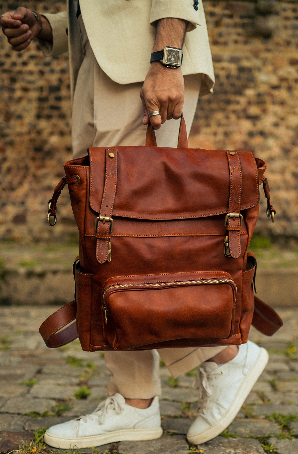 A rustic style Italian leather backpack The Good Earth is for a stylish traveler. So spacious it fits all the essentials of a backpacker and then some. Designed in Italy this full-grain leather backpack ensures maximum security of your belongings with two push-button closures and a working key and a zipped pocket right at your back. Time Resistance premium quality leather backpack is a perfect marriage between practicality, comfort, and luxury.