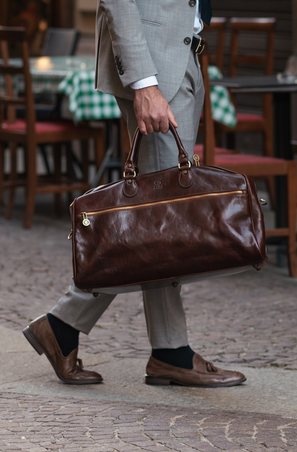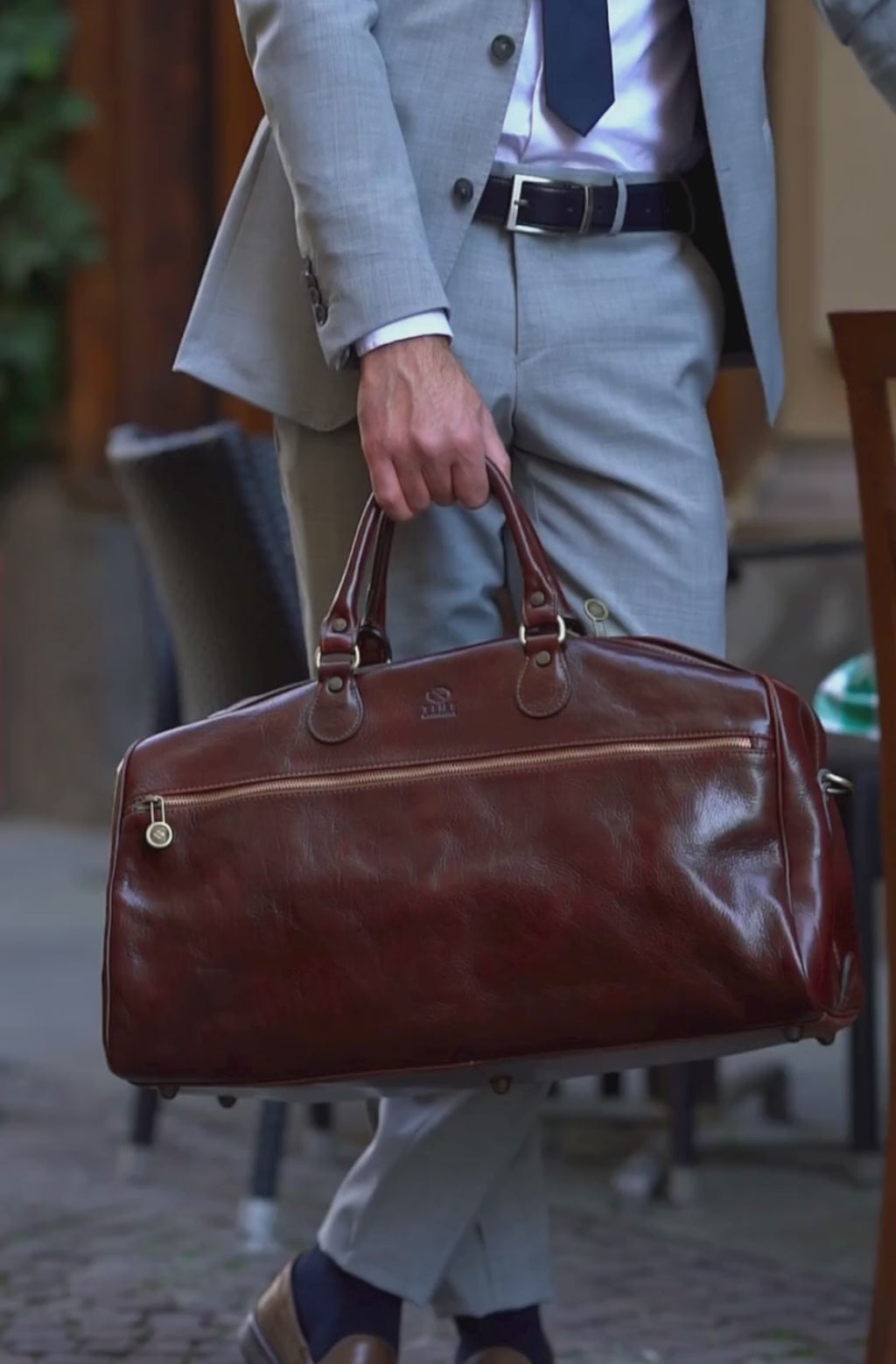 A leather duffel that combines time-tested design and modern life needs. Roomy enough to accompany you on a weekend getaway, short business trip, or to serve as an overnight bag when you’re not sure what the evening will bring.