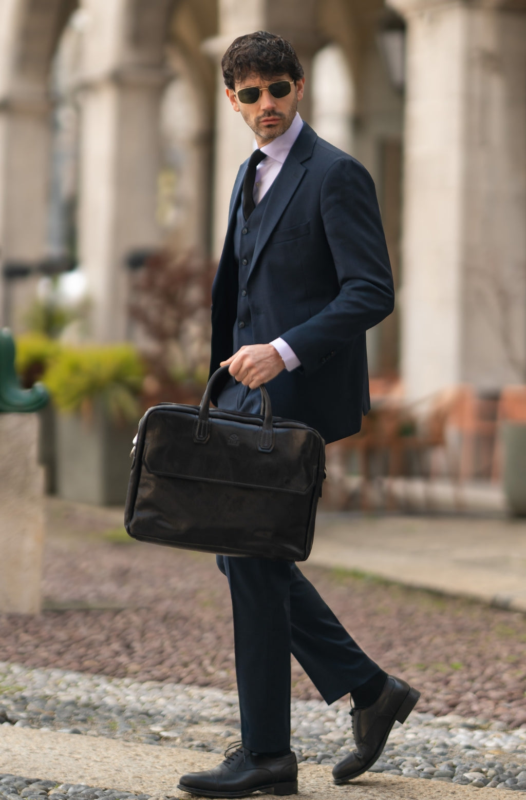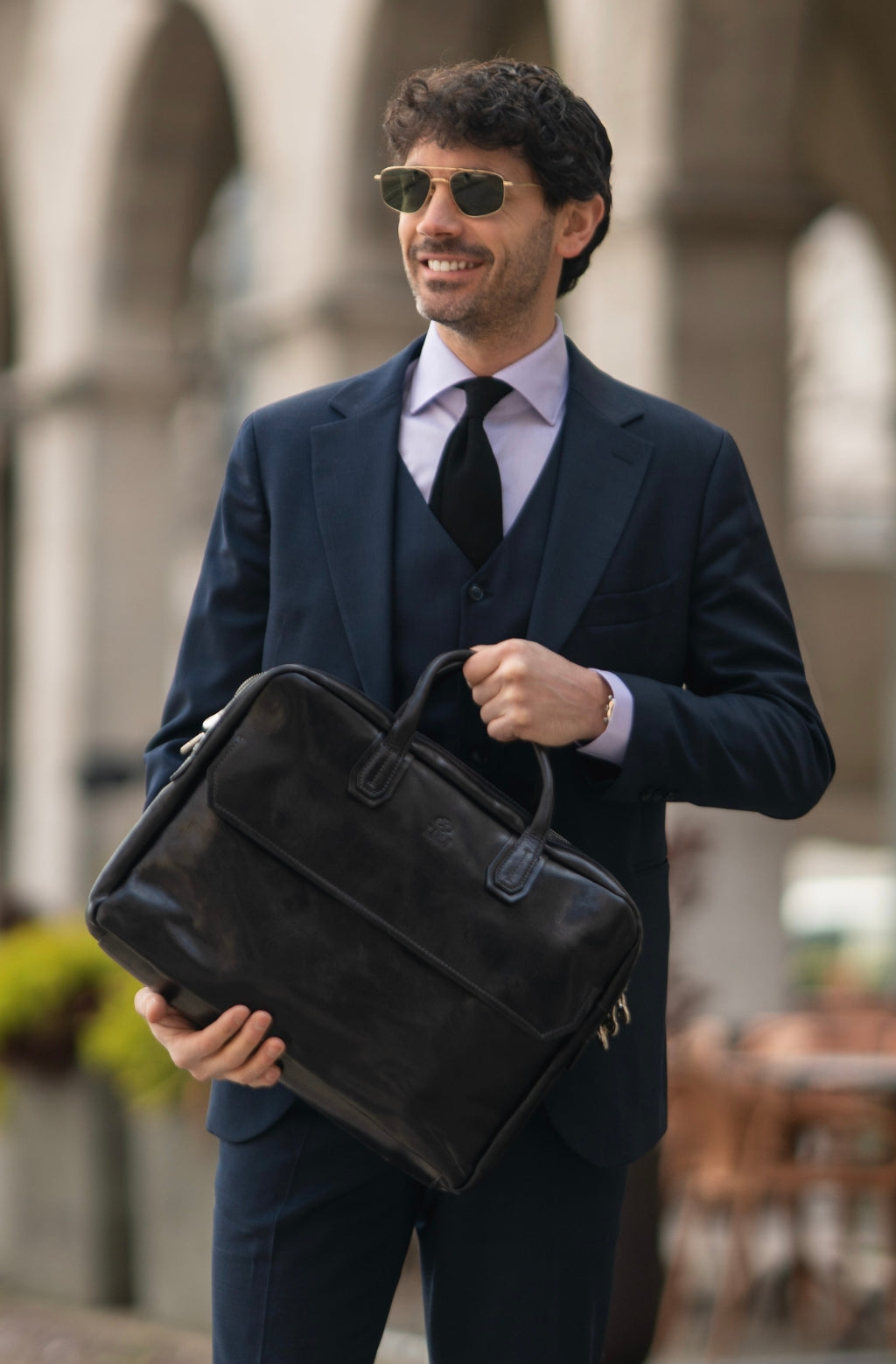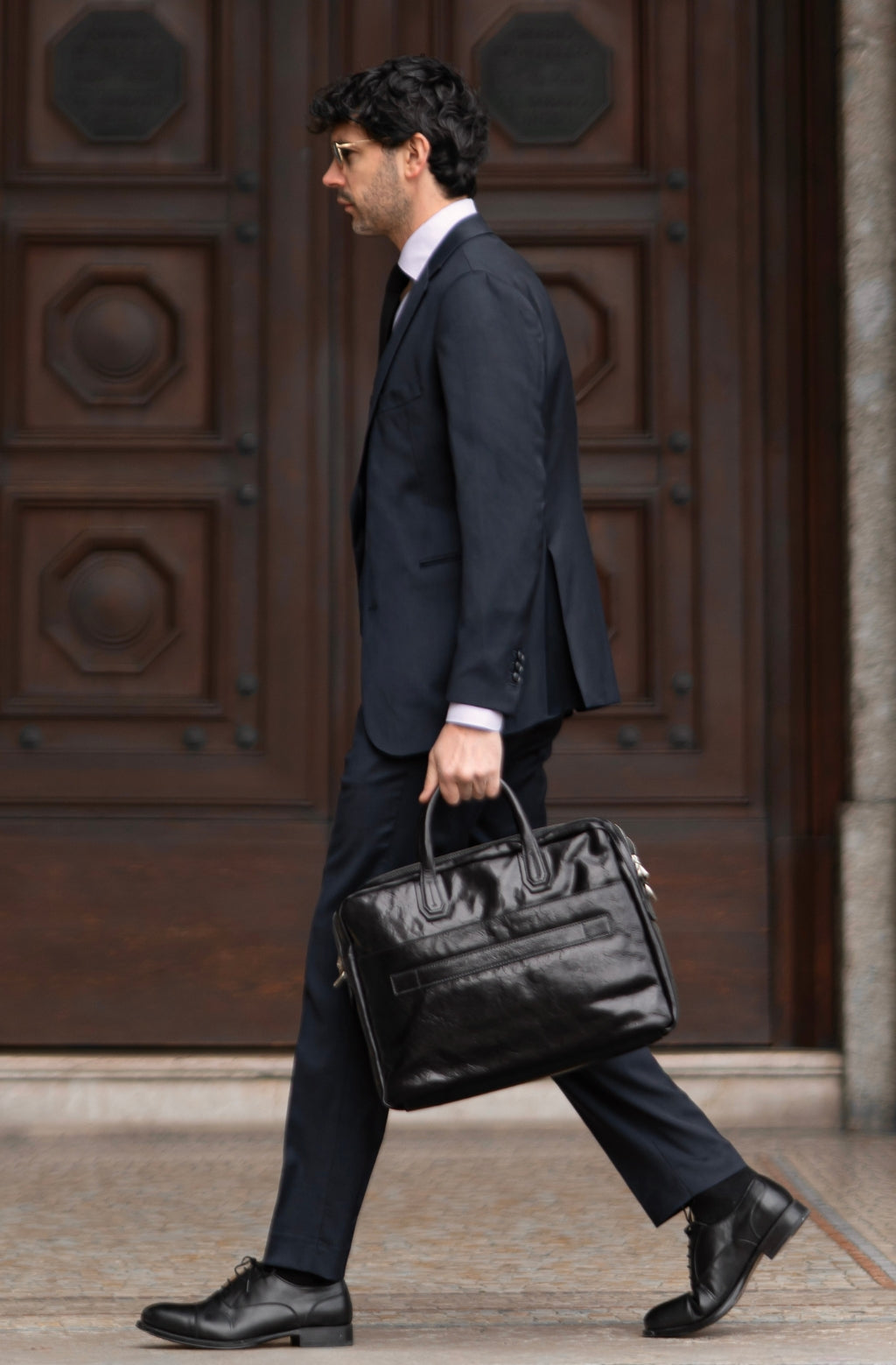 A large leather briefcase Nostromo fits everything you need. Hand-made of full-grain Italian leather the briefcase with a trolley strap and a detachable shoulder strap is a perfect travel companion. Two spacious compartments fit legal size paper, A4 size documents, and folders. In addition, it safely accommodates a 17-inch laptop, and a tablet as padded pockets protect from bumps and scratches. The work bag has plenty of slip pockets and a large zip pocket inside. If that is not enough- we made an additional pocket with a flap on the front and a slip pocket with an extra-strong magnetic closure on the back – ideal for belongings that you need easy access to.
