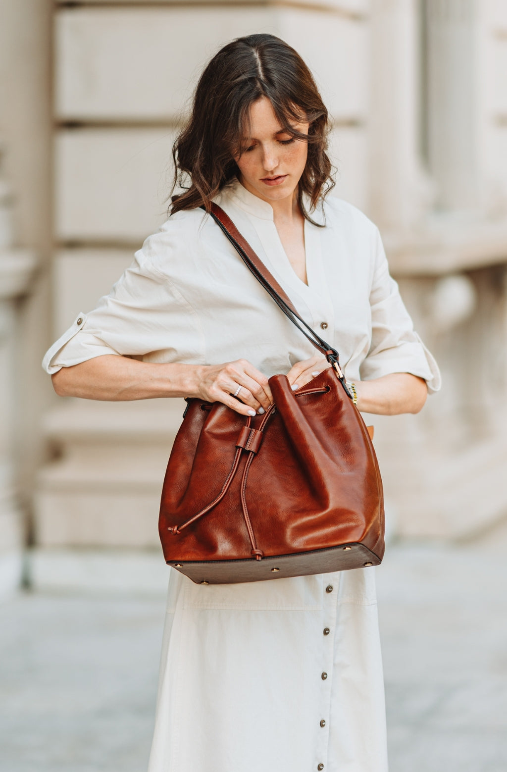 Sybil is a harmonious blend of timeless elegance and modern simplicity. Crafted from full-grain leather, this bucket bag is an effortless statement of refined taste. Its fluid silhouette and thoughtful design make it the perfect companion, whether you're strolling through the city or stepping into a polished affair. With an adjustable handle that combines comfort and grace, Sybil is a quiet celebration of craftsmanship - a bag that evolves beautifully with time, telling your story through its rich leather patina.