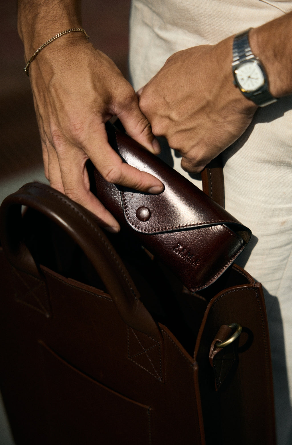 Time Resistance bags and accessories are crafted from premium full-grain, hand-dyed, vegetable-tanned Italian cowhide, known as Vachetta leather, which develops a beautiful patina and ages gracefully over time.