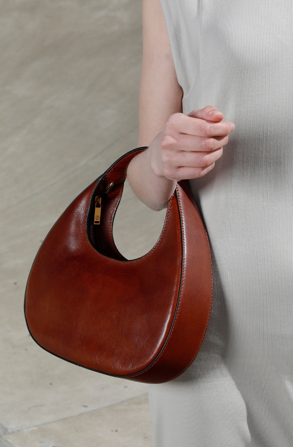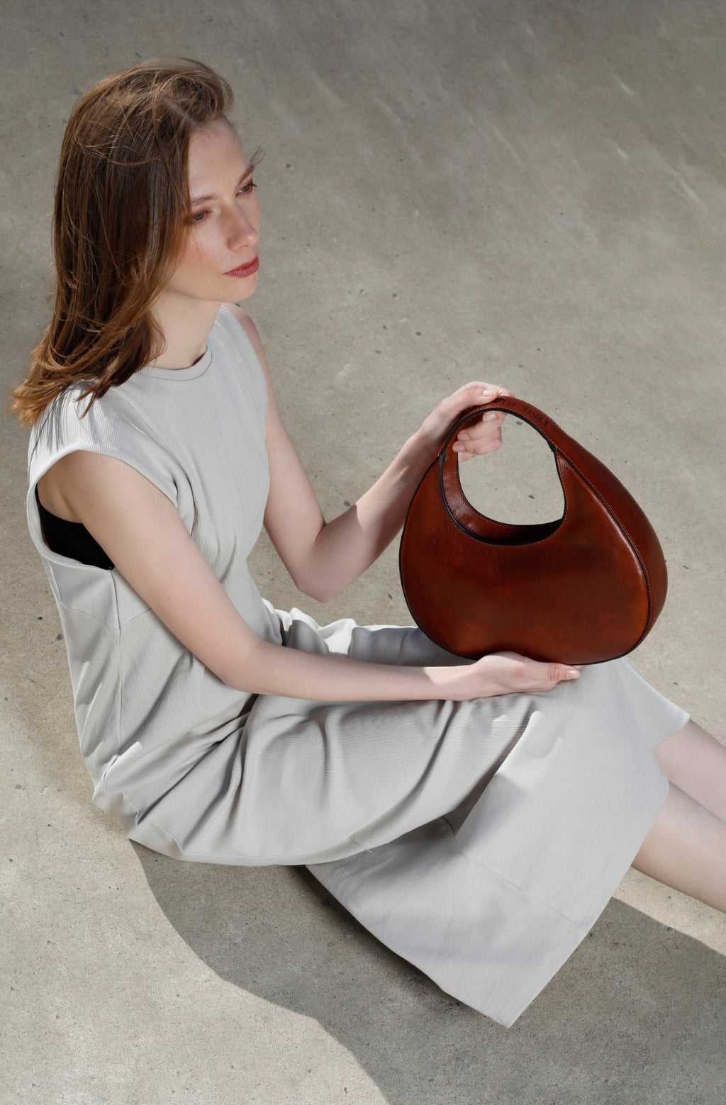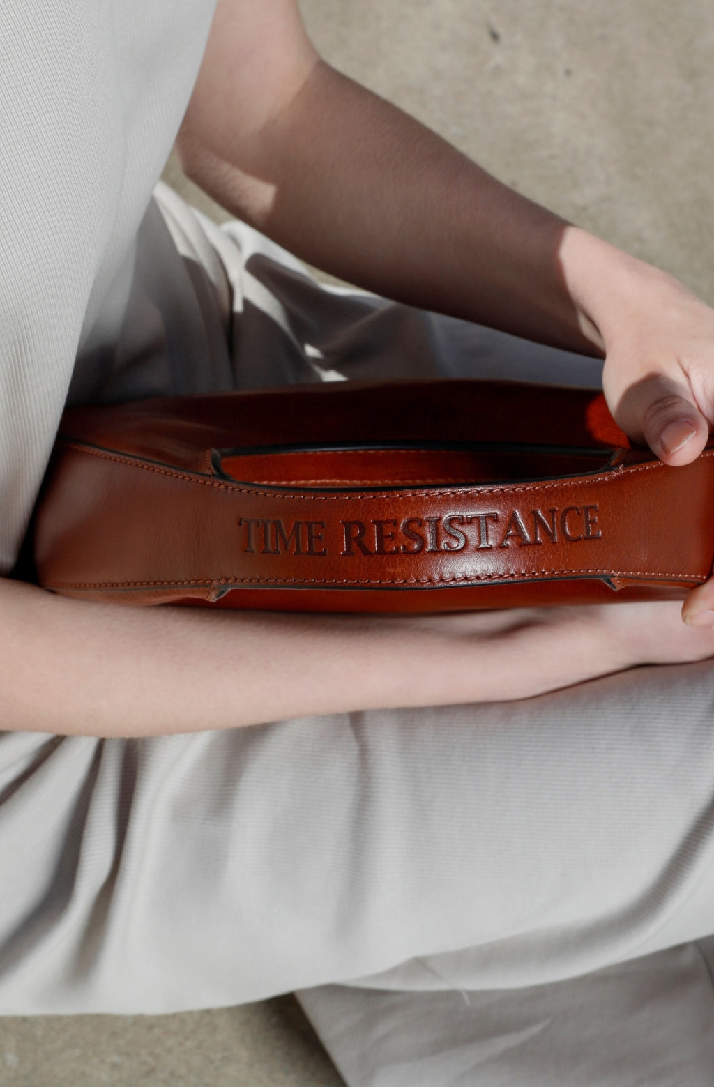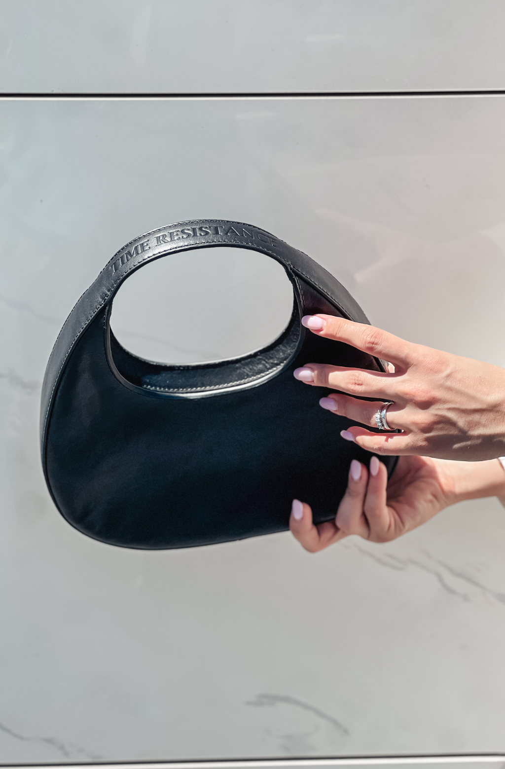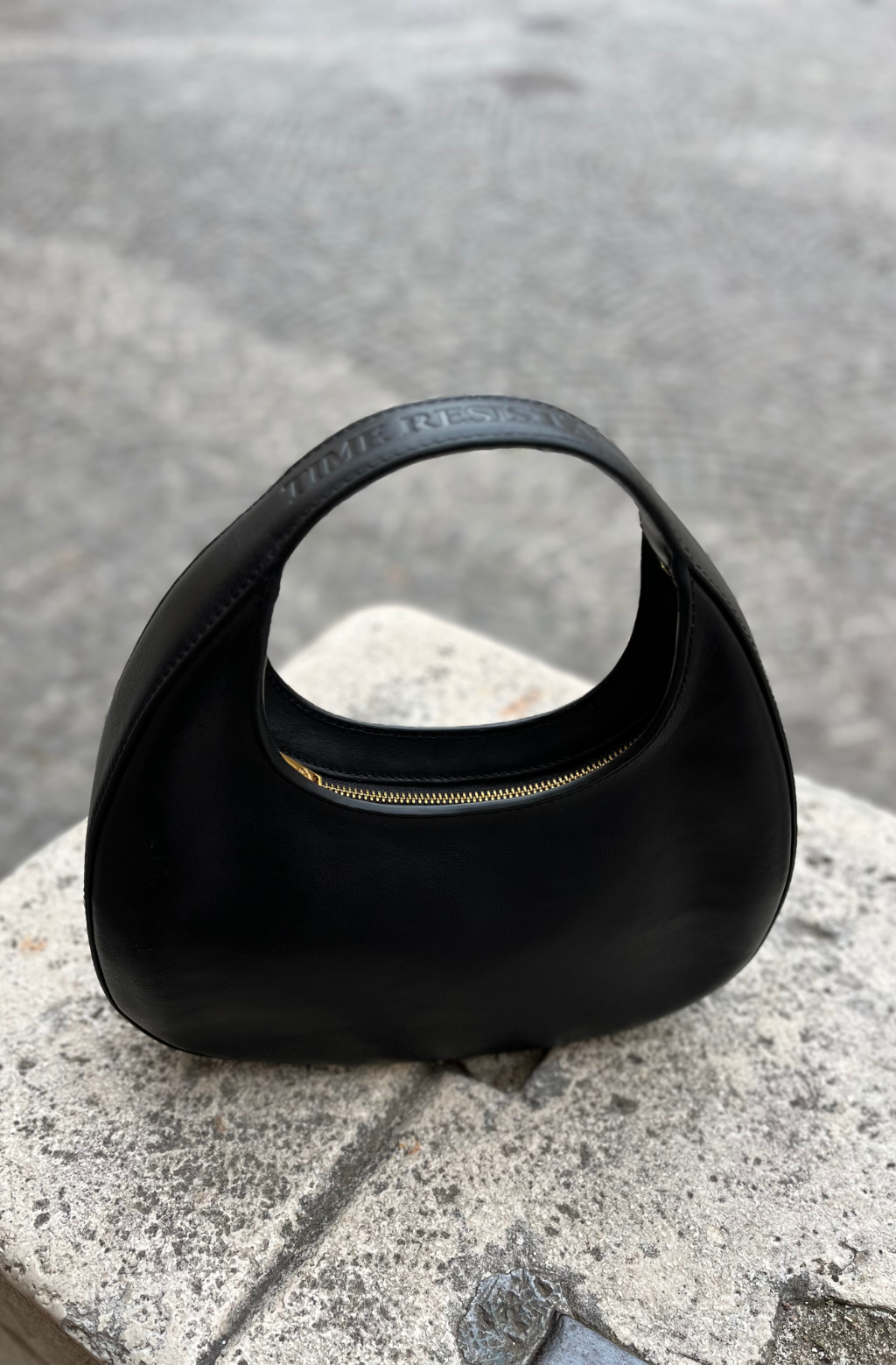 Introducing "The Moonstone" leather handbag, a celestial-inspired accessory that captures the essence of timeless elegance. Crafted with precision, its small, rounded shape evokes tranquil beauty, while the round handle adds a touch of grace. Designed to be cradled in your arm with its compact size, it exudes an aura of effortless sophistication. The zip closure ensures your belongings are securely tucked away, while the sleek minimal design speaks volumes of refined taste. Adorned with the Time Resistance logo on the handle, it's a symbol of quality craftsmanship and enduring style. Illuminate your ensemble with "The" Handbag—an embodiment of celestial allure and understated refinement.