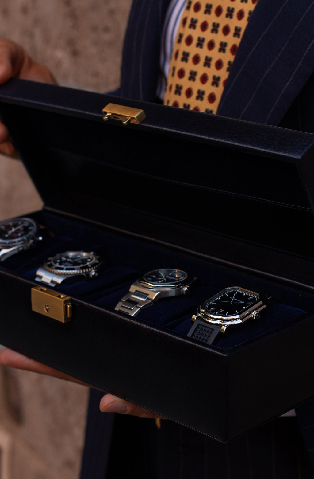 A leather watch box Herzog keeps your timepieces safe and sound. Made of full-grain Italian leather and extra soft velvet, this organizer has slots for four watches. A leather pocket is perfect for storing several watch straps or bracelets. A luxury watch holder can be a stylish accessory on a dresser or it can protect your precious collection of wristwatches while travelling. The box can be personalized with the initials of your loved one or even your favorite quote.