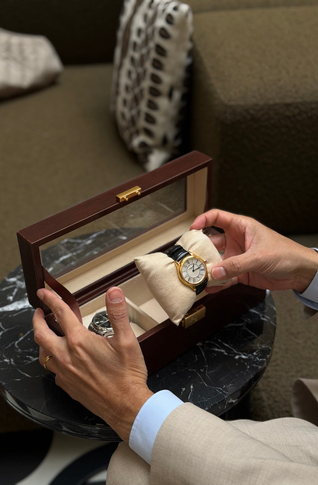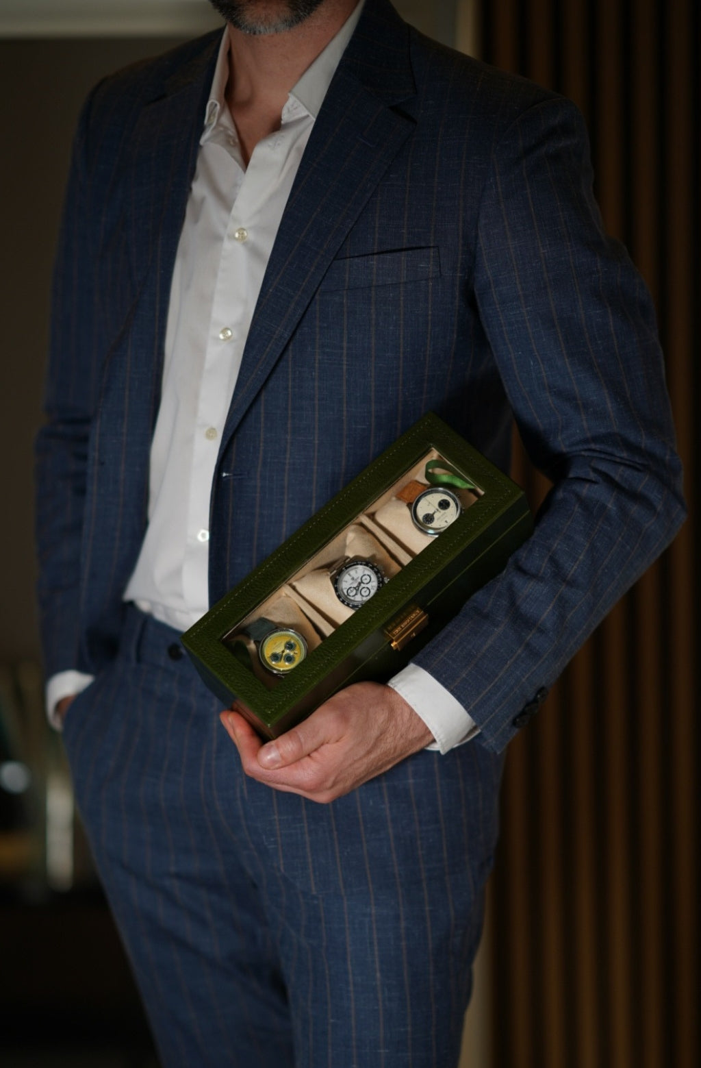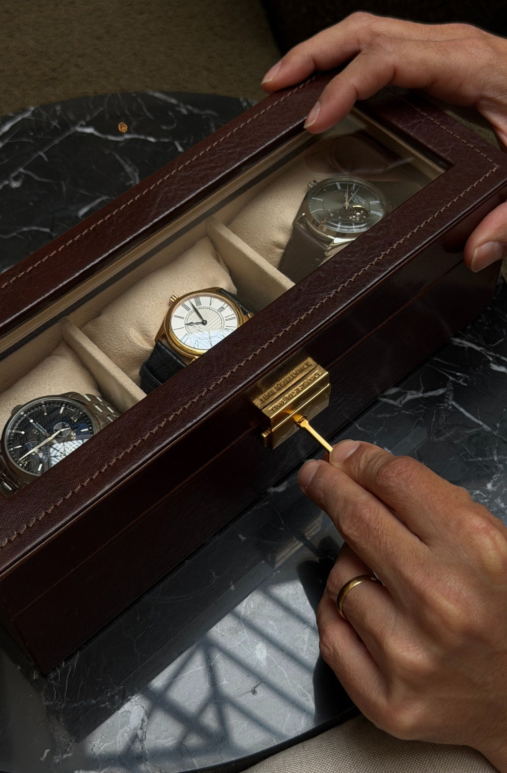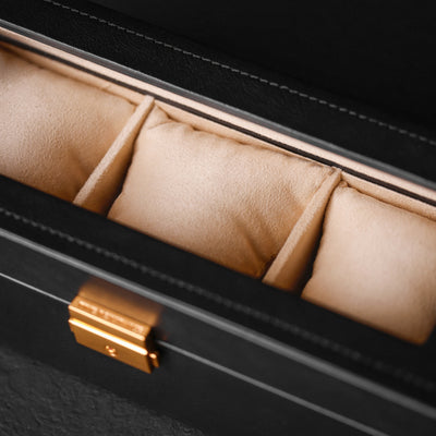 A tribute to quiet luxury, Silence is designed for those who understand the power of presence without noise. Crafted from full-grain leather, it offers an elegant home for your most personal timepieces - objects that mark moments, stories, and memories. With a clear top that offers a contemplative glimpse within, Silence invites appreciation without intrusion. Every detail is shaped by intention - structured, secure, and enduring.