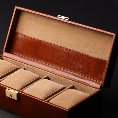 A leather watch box Herzog keeps your timepieces safe and sound. Made of full-grain Italian leather and extra soft velvet, this organizer has slots for four watches. A leather pocket is perfect for storing several watch straps or bracelets. A luxury watch holder can be a stylish accessory on a dresser or it can protect your precious collection of wristwatches while travelling. The box can be personalized with the initials of your loved one or even your favorite quote.